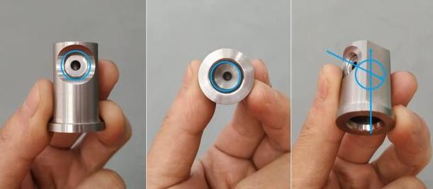小零件內孔去除交叉孔毛刺并不容易,它的孔路有點特殊,首先在底部有個最大的孔,側壁上有3個小孔,然后頂端有個最小的0.3mm的孔。使用流體拋光機去毛刺的時候,很容易在頂端那個小孔那里出現問題。